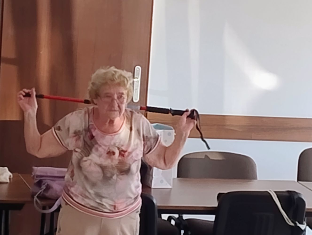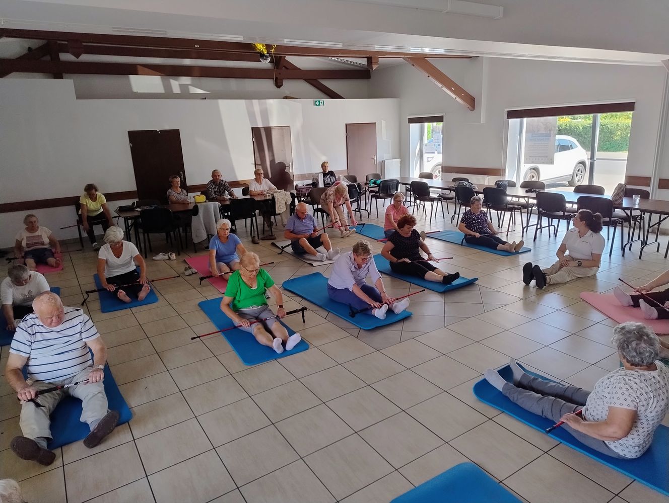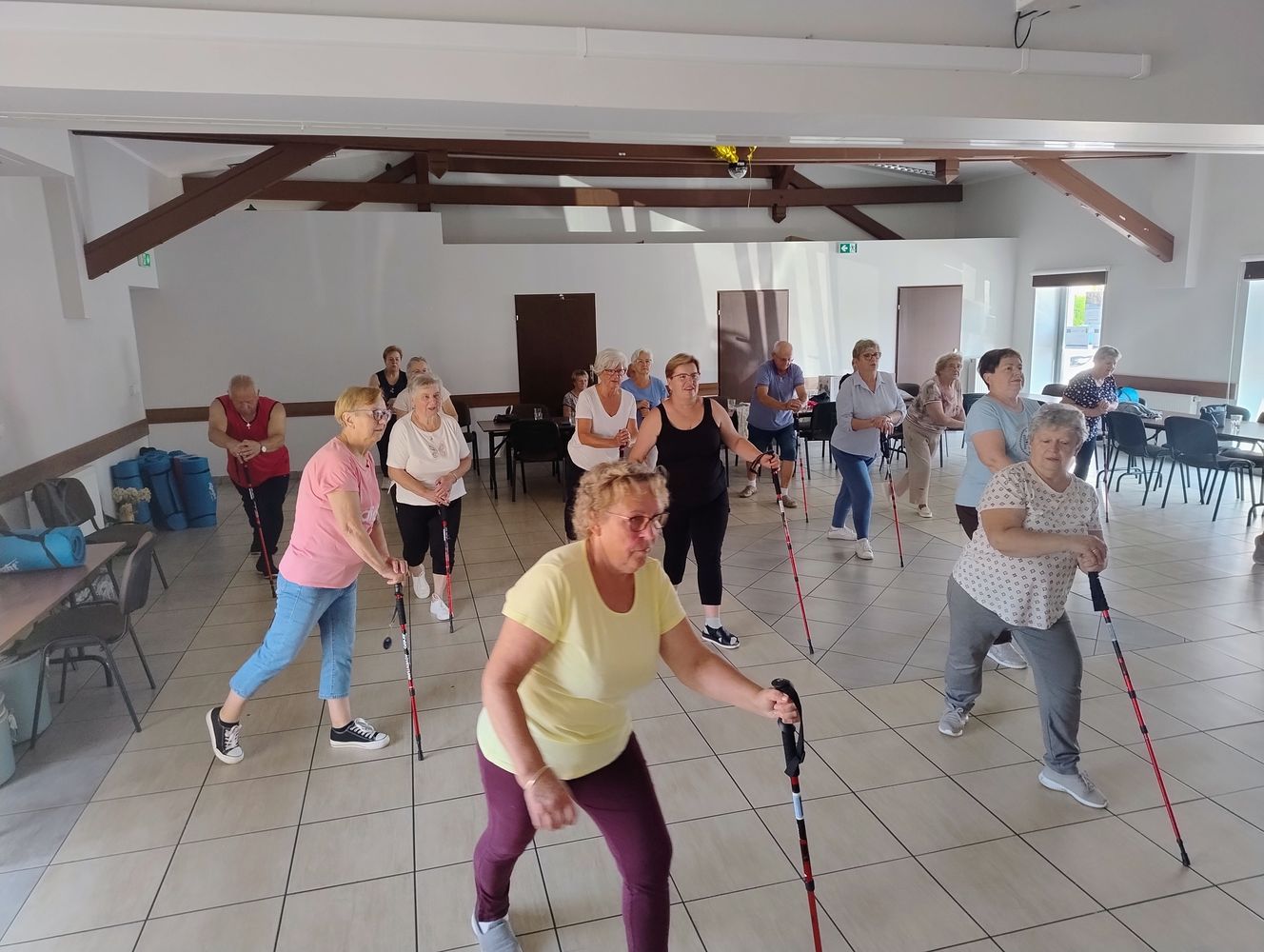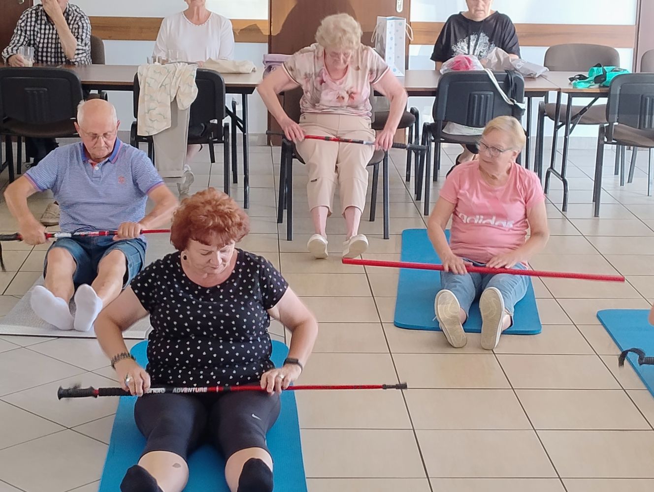 Przeprowadziła wspaniałe ćwiczenia rozciągające na matach i z kijkami🧑‍🤝‍🧑