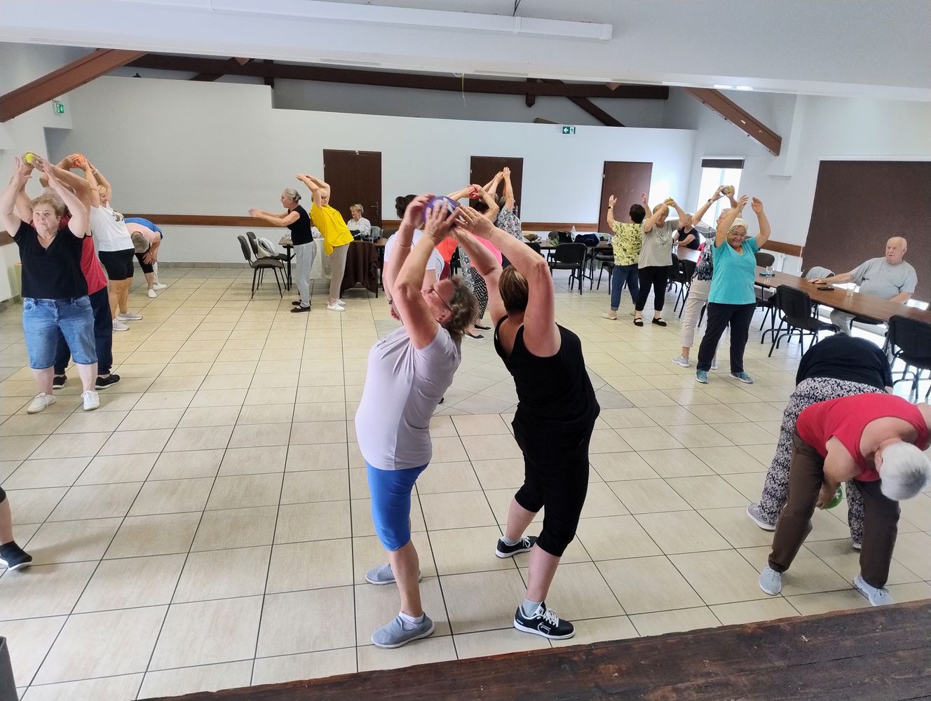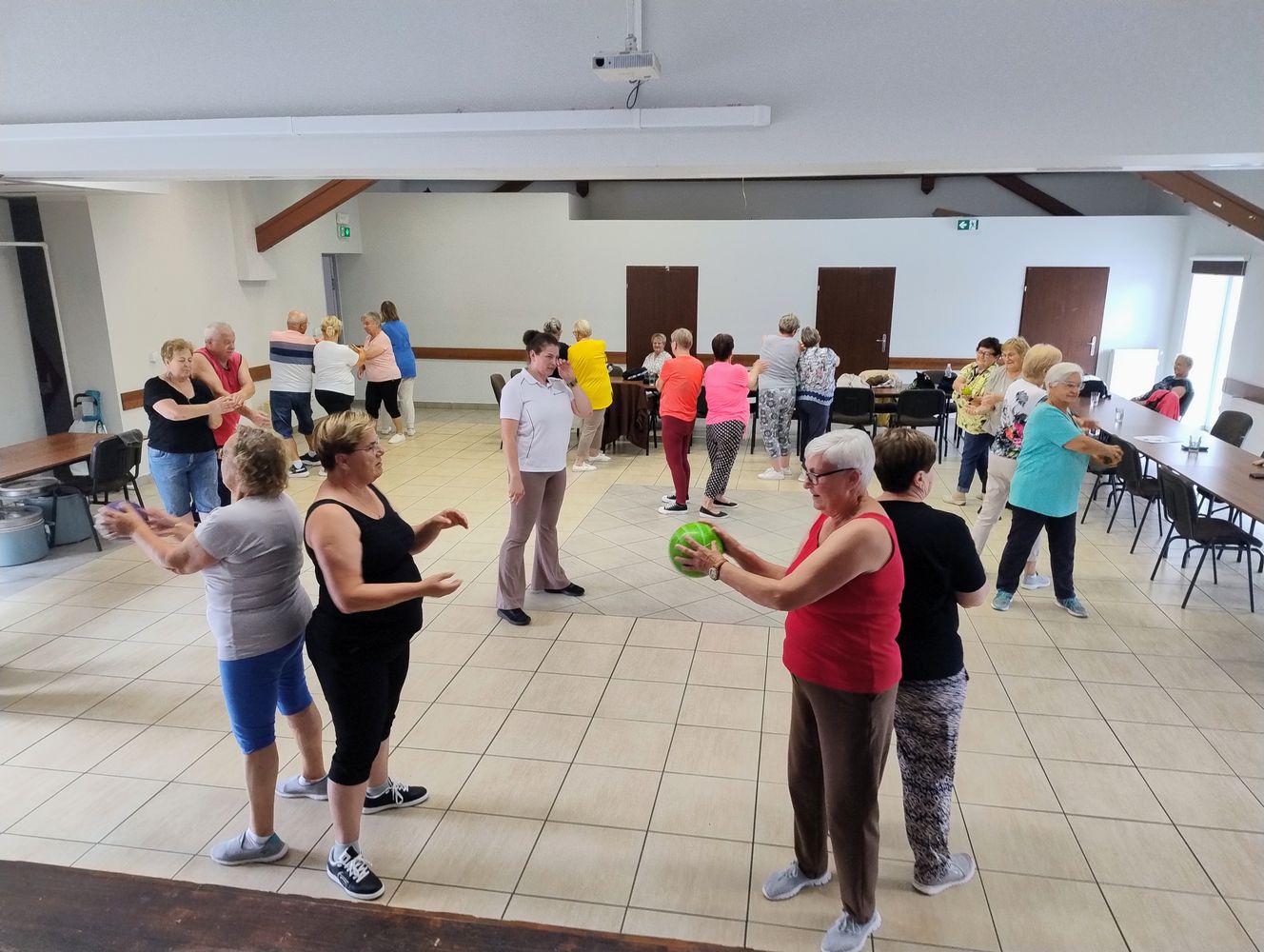 Kto by pomyślał, że piłka może być źródłem takiej koordynacji i śmiechu? Nasi seniorzy zrobili z niego rekwizyt rodem z komedii, ćwicząc równowagę i… cierpliwość do partnera 👩‍❤️‍👨😄Na koniec, kiedy już wszyscy byli rozgrzani do czerwoności, na salę wpadła fala oklasków 👏