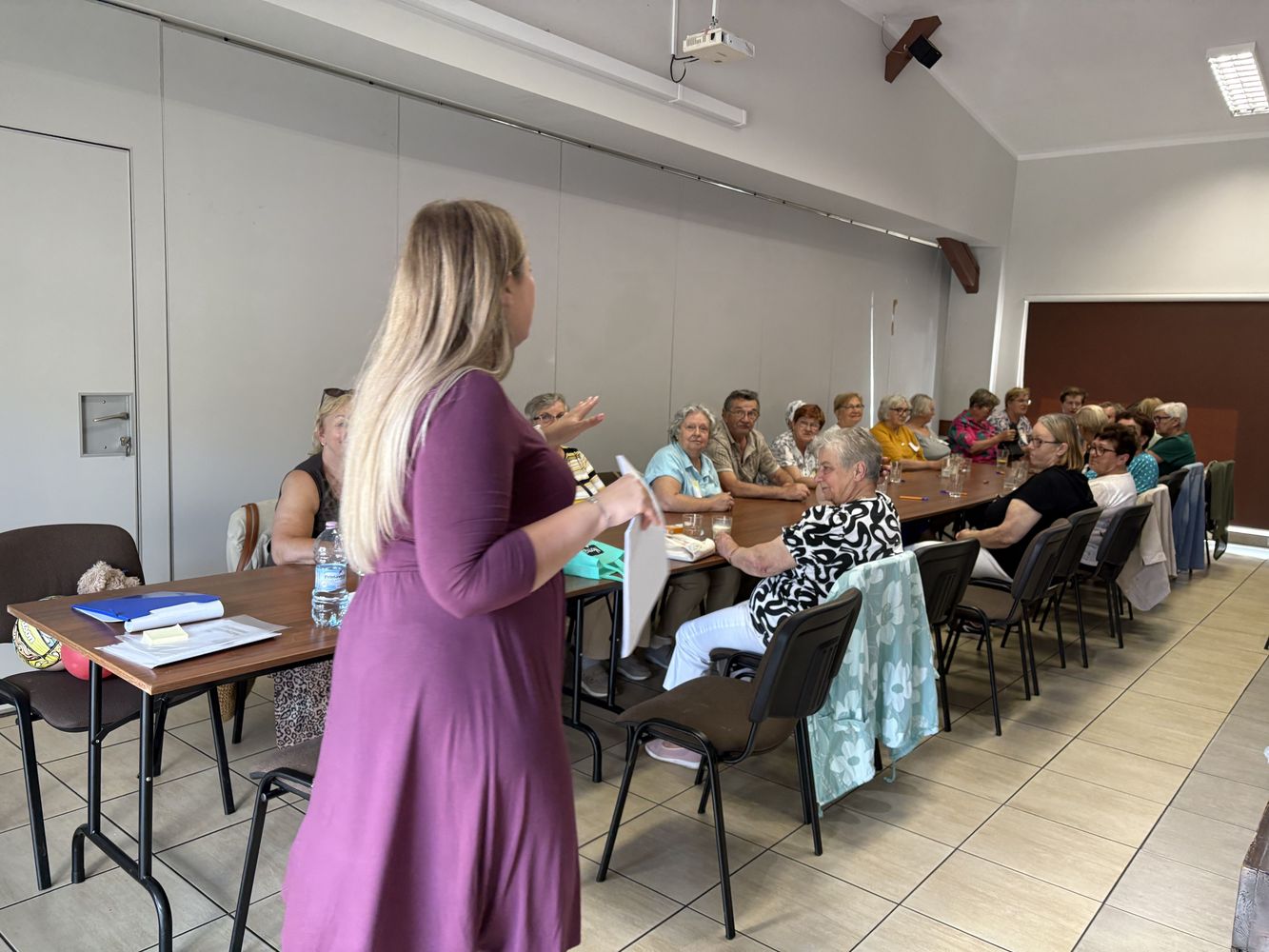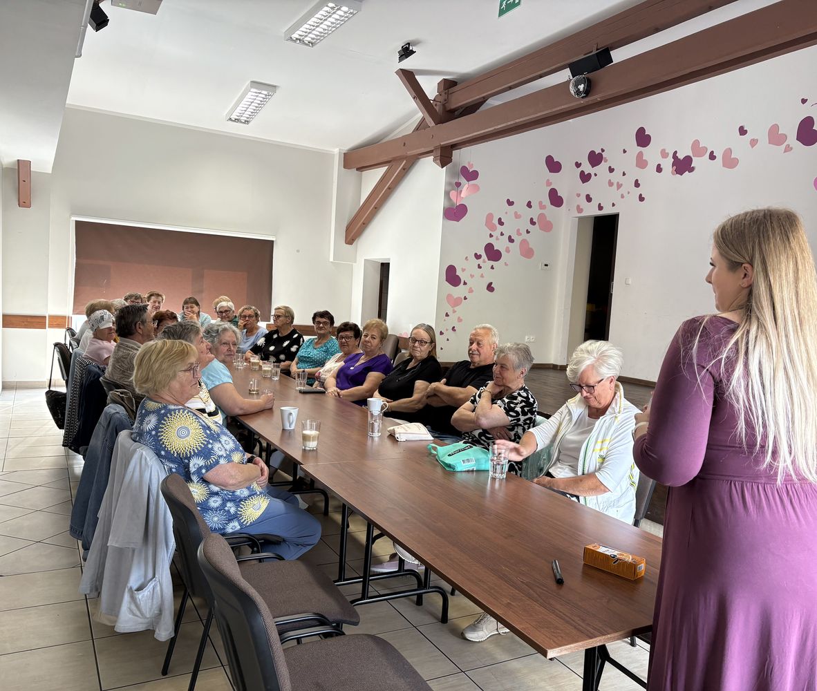 Główna część spotkania poświęcona była omówieniu tematów związanych z emocjami, stresem i potrzebą rozmowy – zwłaszcza w kontekście samotności i codziennych wyzwań osób starszych. Pani Monika prowadziła zajęcia z dużą empatią i zaangażowaniem, odpowiadając na pytania uczestników i zachęcając do wymiany doświadczeń.